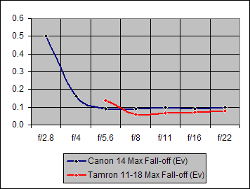 The Shading performance by the Canon 14mm and the Tamron 11-18mm are essentially the same over the f/5.6-22 range where they can be compared.
