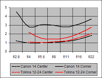 Figure 17. Center and Corner Sharpness for Canon 14mm and Tokina 12-24mm @ 15mm