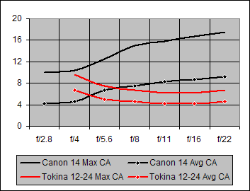 At f/4, the Canon 14mm and the Tokina 12-24mm @15mm have very similar CA performances. But, thereafter, the Tokina significantly outperforms the Canon 14mm in the Chromatic Aberration duel.