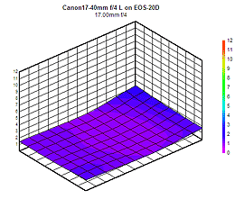 The Canon 17-40mm f/4 L is a high quality lens with a full-frame image circle that showed really exceptional performance on the EOS-20D we used to test it with. (The EOS-20D has a nominally APS-C size sensor, so corner sharpness and distortion will be better than if the lens is used on a camera with a full-frame sensor.) Sharpness at maximum aperture is excellent across the board (just a slight decrease in sharpness around 30 mm), and the "sweet spot" for sharpness is unusually broad, with truly excellent results from f/5.6 to f/8 at all focal lengths.