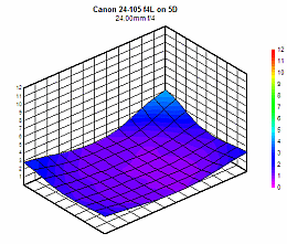 As always when moving from a sub-frame camera to a full-frame one, the 24-105mm lost a little sharpness in the corners, and chromatic aberration, distortion, and shading all got somewhat worse. That said though, corner sharpness and CA were both much better than most zooms we test, and stopping down to just f/5.6 made dramatic improvements in sharpness. Worst-case chromatic aberraton did increase noticeably, but the average CA levels remained very close to those we found on the 20D body, once again suggesting that the worst CA is limited to a relatively small area around the edges and corners.