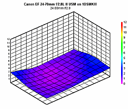 On the full-frame Canon 1Ds mkIII however, the lens creates images with corners that are significantly darker than the center. In the worst case, 24mm at ƒ/2.8, the extreme corners are almost 1 1/3 EV darker than the center. Other focal lengths at ƒ/2.8 show corners that are darker to the tune of 3/4 to 1 EV. Stopping down to ƒ/4 improves this dramatically, however, the only settings you can use which will guarantee you have no corner shading are to use 35mm or longer, and an aperture of ƒ/5.6 or smaller.