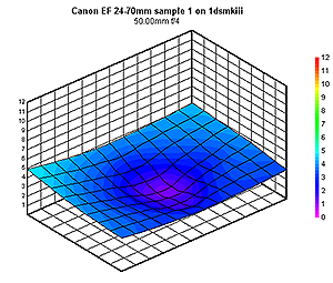 The whole story is revealed with the lens mounted on the full-frame 1Ds mkIII. With the aperture set to ƒ/4, we note areas of sharpness in the center of the frame, bounded by significant corner shading, at the 24mm, 35mm and 70mm settings. At 50mm and ƒ/4, we see the same spot of sharpness as on the subframe, but it now covers a much smaller area, and there's significant softness across the rest of the full-frame image area. It's worth noting that these results were found on the third of the three lenses we tested: on the first two lenses, results were poor indeed: