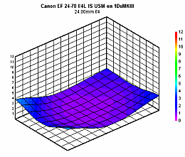 The whole story is revealed with the lens mounted on the full-frame 1Ds mkIII. With the aperture set to ƒ/4, we note areas of sharpness in the center of the frame, bounded by significant corner shading, at the 24mm, 35mm and 70mm settings. At 50mm and ƒ/4, we see the same spot of sharpness as on the subframe, but it now covers a much smaller area, and there's significant softness across the rest of the full-frame image area. It's worth noting that these results were found on the third of the three lenses we tested: on the first two lenses, results were poor indeed: