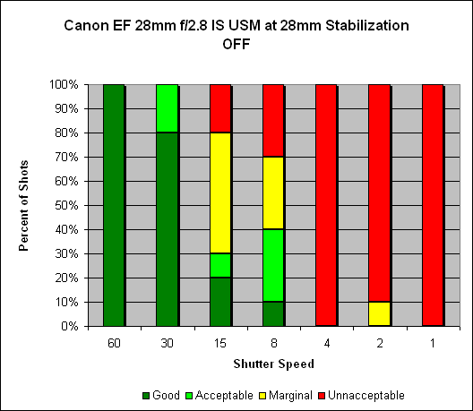 With image stabilization turned off, we see results just like you would expect with the "one-over-focal length" rule of thumb: images should be more or less sharp with this lens at the 1/30s point, and indeed, 80% of them are keepers. With image stabilization turned on, we get around two and a half stops of hand-holding improvement: excellent results at the 1/15s and 1/8s shutter speeds, and even 60% of the time at 1/4s.