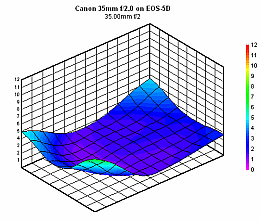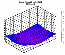 In a blur-measurement contest (on the EOS-20D) with its relatives, the Canon 35mm f/1.4L and the Sigma 30mm f/1.4, the Canon f/2 fares very, very well. More specifically, at f/2 the Canon f/1.4L outperforms the Canon f/2, which, in turn, slightly betters the Sigma lens. However, from f/2.8 through f/11, the two Canon lenses have very similar blur performances, while the Sigma lens is measurably third. At f/16 and f/22, the Canon f/2 actually (very) slightly outperforms the Canon f/1.4.