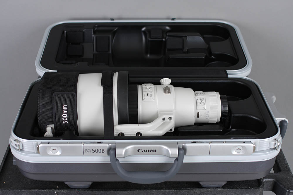 The 500mm ƒ/4L IS II USM epitomizes the saying of something being ''built like a tank''. Like all L-series glass, the 500mm is dust- and weather-resistant, built with great attention to detail. The lens ships in a hard case about the size of a trunk, complete with a padded interior, and given the price of this lens, it is indeed a welcome part of the kit. There's no front cap for this lens - rather, there is a leather-like lens hood (model E-138B) to protect the whole front half of the lens.