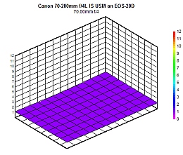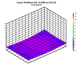 If you move the vertical slide upwards, the blur plots for f/5.6, 8, etc., display. As you move the horizontal slider to the right, the blur plots for 70mm, 100mm, 135mm, and 200mm display. Perhaps the most interesting feature of the blur plots for the Canon 70-200mm f/4L IS is the almost uniform flatness across the entire focal length-aperture spectrum. This demonstrates that this lens has no corner softness (relative to the center), period. And the "dark blueness" of the plots for apertures f/4 through f/16 at all focal lengths indicates a lens with sharp-flat images. Even at f/22 and f/32 (where diffraction degrades the image) the plots remain relatively flat.