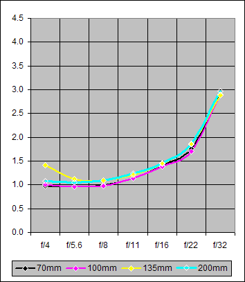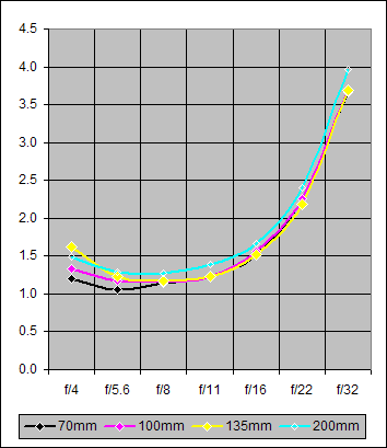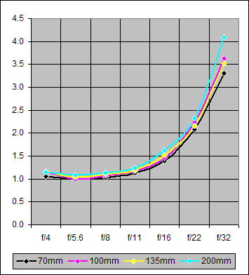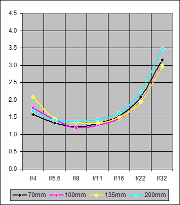 Figure 1 below is a graph of the Center Sharpness in the range f/4-32 for focal lengths of 70mm, 100mm, 135mm, and 200mm. As indicated, these results were obtained with the lens mounted on the Canon 20D.