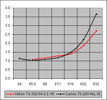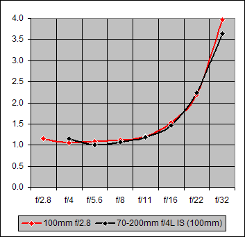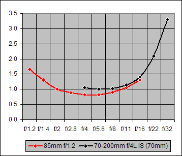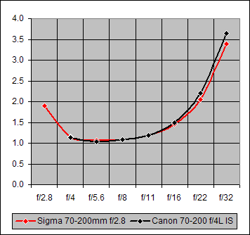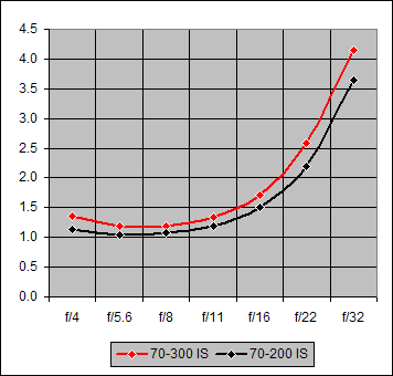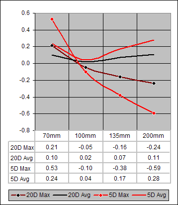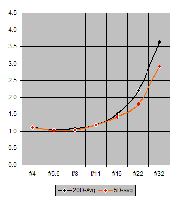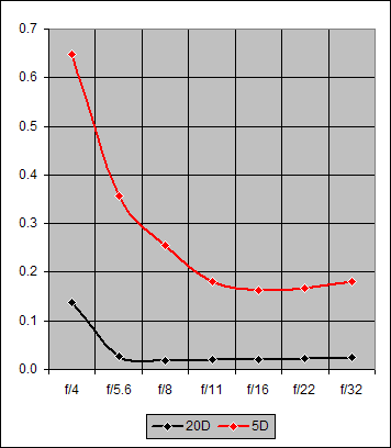 Each of the seven points on the 20D (black) curve of Figure 5 is the average over all four focal lengths (70mm, 100mm, 135mm, 200mm) of the blur values for the specified f/-value. The red curve points are the correspondingly-averaged values for the 5D. The two curves are essentially identical for f/4-11. At f/16 where diffraction effects are becoming noticeable, the 5D is slightly less affected by them relative to the 20D. And this difference grows at f/22 and f/32 where the decreasing aperture diameter is increasing the diffraction effects.