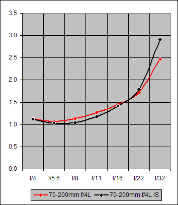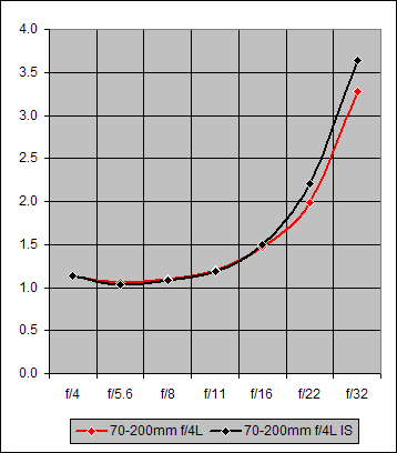 With the addition of Image Stabilization to the Canon 70-200mm f/4L, one might expect the overall optical performance to be degraded a bit. Happily, that doesn't appear to be the case here. To see this, let's take a look at a few graphs. (I do love graphs...)