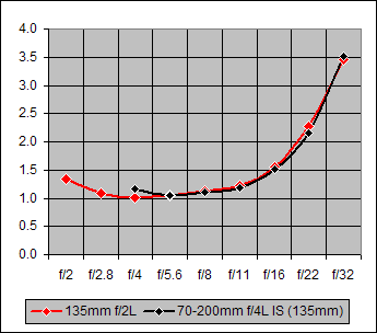 Figure 14. Center Sharpness (at 135cm) for the Canon 70-200mm f/4L IS and the Canon 135mm f/2L on the Canon 20