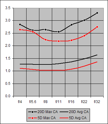 Figure 6 (above) summarizes the CA performance for the Canon 70-200mm f/4L IS on both the 20D and the 5D. As before, each point on either of the curves is the average for that f-stop over the four focal lengths used in this report. The graph reveals a slightly better CA performance on the 5D relative to the 20D. But, overall, a CA rating of "Average" for this lens remains appropriate.