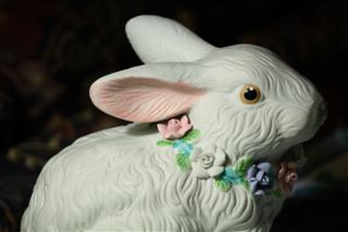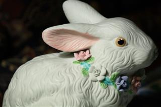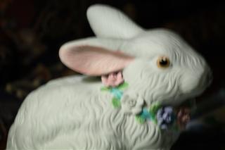 Not having a good way to objectively measure the effects of Image Stabilization, we've only shared casual observations regarding it in our reviews. Our experience in using this lens' IS in a number of hand-held "bird" shots was so exceptional though, that we decided to indulge in a little non-quantitative testing. For the test, we chose a low-light situation, a 200mm focal length, and a low ISO (100) to photograph a seasonal ceramic rabbit. (We found the ceramic rabbit somewhat more cooperative than the live ones hopping about the shrubbery.) First, we mounted the Canon 70-200mm f/4L IS - Canon 30D combination on a tripod. A shutter speed of 1/15 sec gave a good exposure with a good-looking histogram, and the photograph (one of three essentially identical images) just below resulted (IS off).