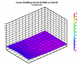 The 70-300mm had the most trouble on the full-frame body exactly where you'd most expect to see it, in light falloff (vignetting) and geometric distortion. The distortion curve was almost an exact duplicate of the one from the 20D, simply magnified. Maximum barrel distortion at 70mm rose to 0.57%, while maximum pincushion at 300mm increased to a very noticeable 0.73%. Vignetting also increased pretty dramatically, but was still less than that found on many lenses. The maximum light falloff was right around a half a stop at all focal lengths, decreasing to less than 1/4 EV when the aperture was stopped down one notch. All these defects can be corrected to a reasonable approximation in Adobe Photoshop CS2 with the Lens Correction filter. For a more complete correction, DxO Optics Pro supports this lens on a variety of Canon bodies, but unfortunately not on any pro models, such as the EOS-5D, 1Ds Mark II, 1D Mark II N, etc. (DxO does support the 70-300mm f/4.5-5.6 DO IS USM on pro bodies, but not the conventional non-DO model we tested here.)