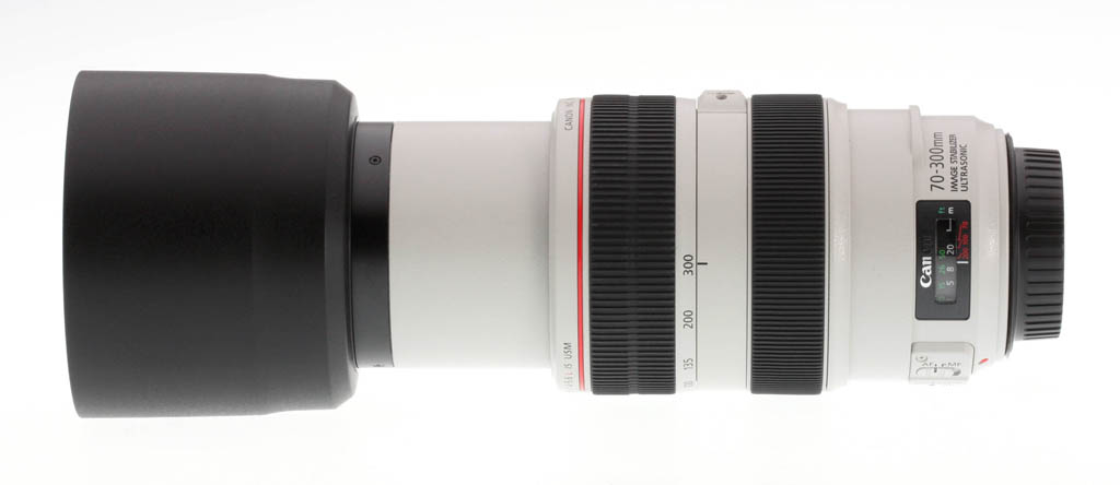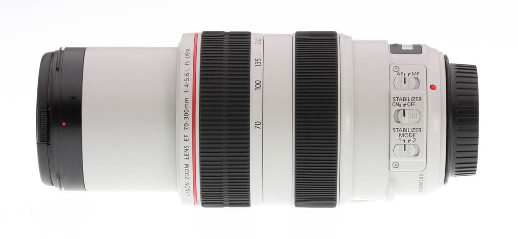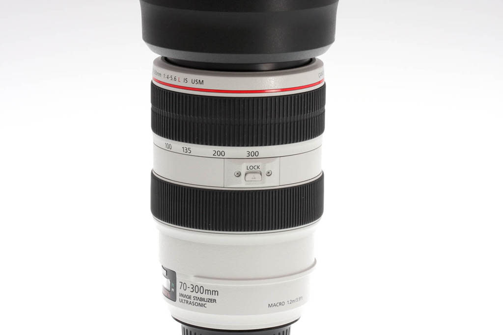 The zoom ring is composed of rubber with large ribs, about 1 inch wide. The ring takes about ninety degrees of turning action to go from 70mm to 300mm, and again, the ring is very smooth, firm but not too tight; it requires two fingers to move. Zoom creep isn't a problem with this lens, but even so Canon has thought to include a zoom lock switch that keeps the lens parked in its 70mm position. There is some lens extension as the lens is zoomed in towards 300mm; at maximum length, the lens adds 2 inches to its overall length.