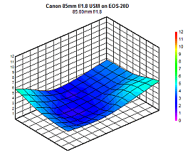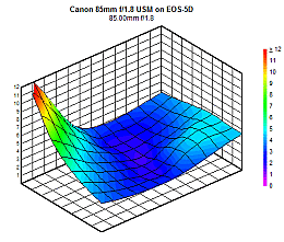 Center Sharpness for the Canon 85mm f/1.8 on both the Canon 20D and 5D are shown in Figure 1 to be very similar. Using DxO's Blur Scale, the center portions of the images are "Sharp" in the f/2.8-f/16 range. Diffraction degradation renders the f/22 centers to be "Slight Blurred" for this lens. At f/1.8 and f/2, the images are also "Slightly Blurred". All in all, the Center Sharpness for the Canon 85mm f/1.8 lens is very good.