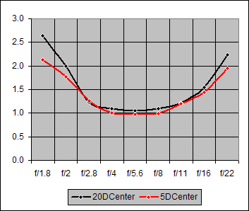 Figure 1. Center Sharpness for Canon 85mm f/1.8 on Canon 20D and Canon 5D
