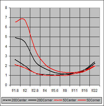 Figure 2. Center and Corner Sharpness for Canon 85mm f/1.8 on Canon 20D and Canon 5D