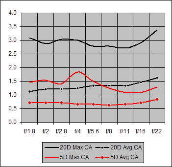 Figure 3. Maximum and Average Chromatic Aberration for Canon 85mm f/1.8 on 20D and 5D