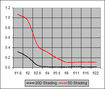 Figure 4. Shading ("Vignetting") for the Canon 85mm f/1.8 on Canon 20D and Canon 5D
