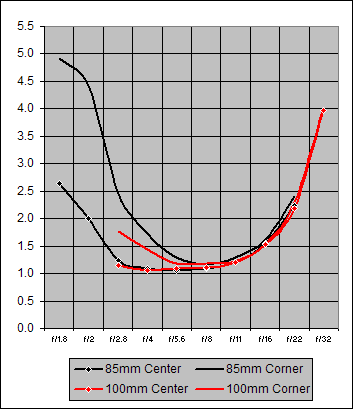 Figure 11.Center and Corner Sharpness for Canon 85mm f/1.8 and Canon 100mm f/2.8