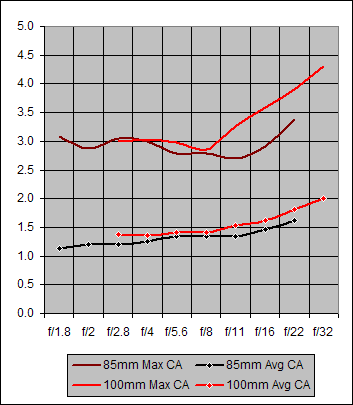 Figure 12. Maximum and Average Chromatic Aberration for Canon 85mm f/1.8 and Canon 100mm f/2.8