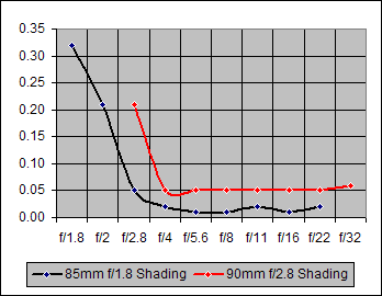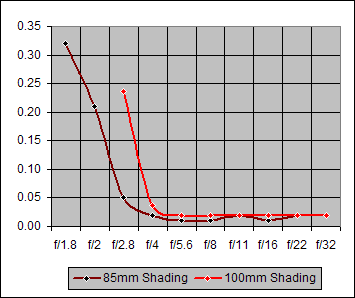 Shading by the Canon 85mm f/1.8 and the Canon 100mm f/2.8 is the same over the f/4-f/22 aperture range. The higher shading by the 100mm lens at f/2.8 is significant, but not unexpected, as most lenses exhibit increased shading at their widest aperture, as does the 85mm at f/1.8-2.