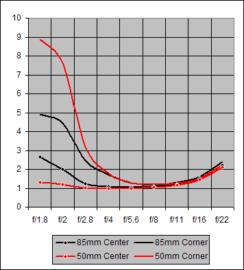 Figure 8. Center and Corner Sharpness for Canon 85mm f/1.8 and Canon 50mm f/1.8