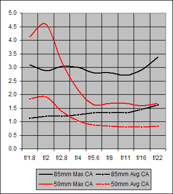 The Canon 85mm f/1.8 exhibits significantly better Chromatic Aberration performance for the wider apertures, f/1.8 and f/2. But for apertures f/4-f/22, the 50mm lens is a significantly better CA performer than the 85mm.