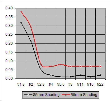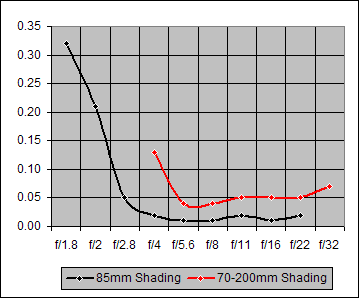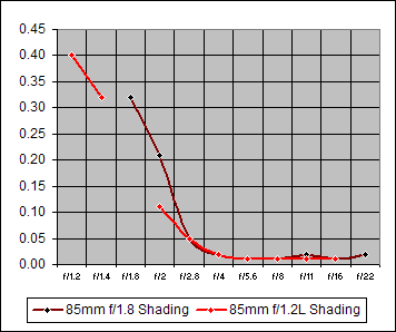 The Shading graphs of Figure 7 show very similar Shading for the Canon 85mm f/1.8 and the Canon 85mm f1.2L. Even so, the f/1.2L does slightly better than the f/1.8 below f/2.8.