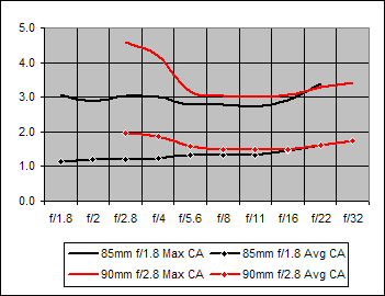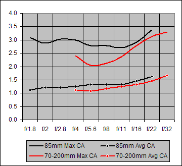 Over the f/4-f/22 aperture range shared by these two lenses, their Average CA performances are indistinguishable. The Canon 70-200mm does exhibit a midrange f/4-f/11 Maximum CA that is slightly better than that of the Canon 85mm f/1.8.