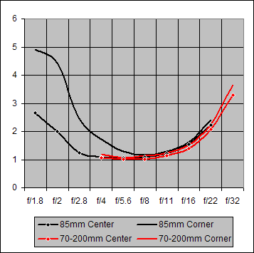Center and Corner Sharpness by the Canon 85mm and the Canon 70-200mm @ 70mm are essentially identical. The poorer Center and Corner performances by the 85mm occurs primarily for f/1.8-f/2.8, below the f/4 minimum aperture for the 70-200mm lens.