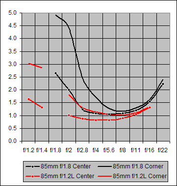 Figure 5. Center and Corner Sharpness for Canon 85mm f/1.8 and Canon 85mm f/1.2L
