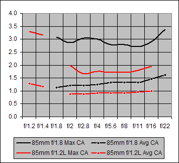 Figure 6. Maximum and Average Chromatic Aberration for Canon 85mm f/1.8 and Canon 85mm f/1.2L
