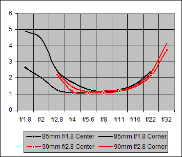 Figure 17. Center and Corner Sharpness for Canon 85mm f/1.8 and Tamron 90mm f/2.8