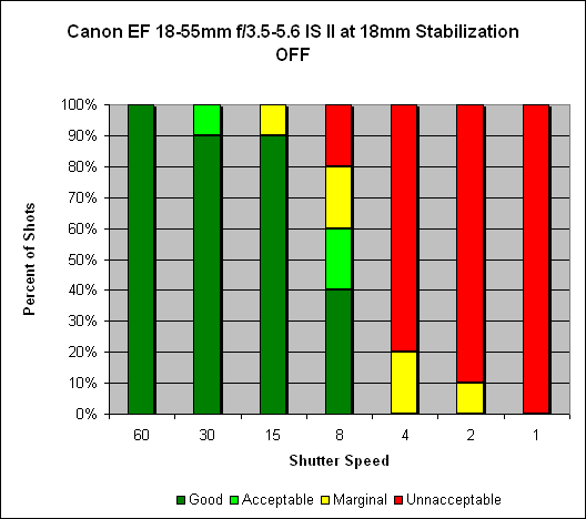 Zoomed in to 55mm, we see about three and a half stops of stabilization. As expected, the typical shooter, without stabilization, can get consistently sharp images at 1/60s (see the "one over focal length" rule of thumb); with stabilization on, the shooter can get consistently sharp images at speeds as low as 1/8s. Around half the time, even as low as 1/4s.