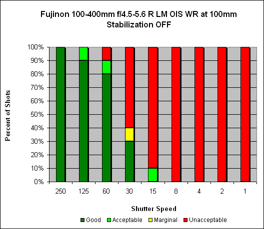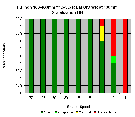 At 100mm, we see what we'd expect with OIS (Optical Image Stabilization) turned off: consistently sharp images at the 1/125s mark (well, 90% sharp, it's a big lens). With OIS activated, we see sharp, hand-held images at speeds as slow as 1/8s, and 70% sharp at 1/4s - for a hand-holding improvement of around four or four-and-a-half stops.