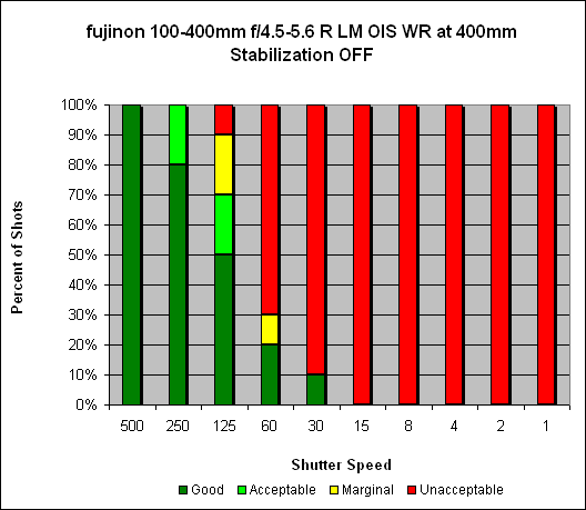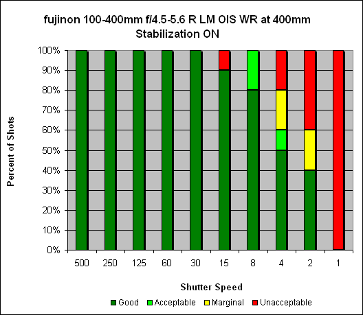 At 400mm, it's almost the same story: consistently sharp images at the 1/500s mark. With OIS activated, we see sharp, hand-held images at speeds as slow as 1/30s, and 90% sharp at 1/15s - for a hand-holding improvement of around four stops.