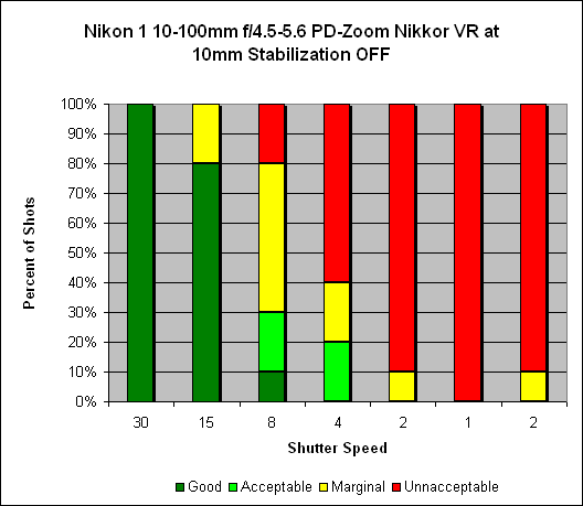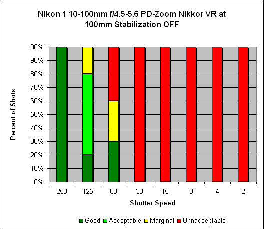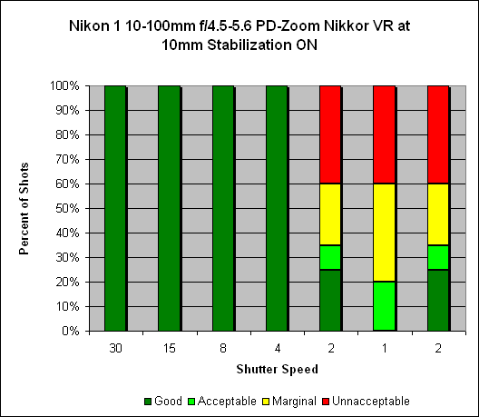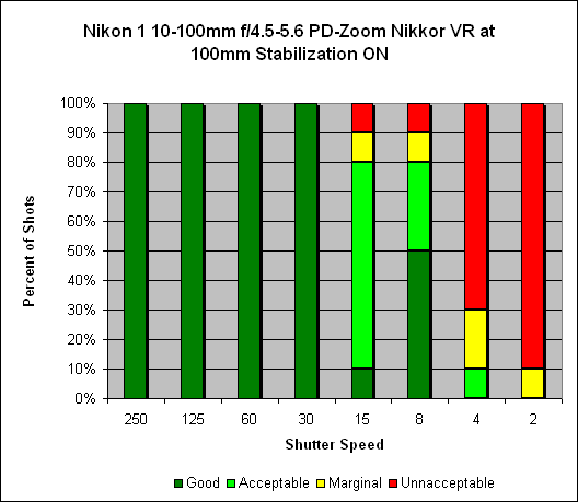 Zoomed in to 100mm, we see about three and a half stops of stabilization. We would normally expect the typical shooter, without stabilization, to get consistently sharp images at 1/125s (see the "one over focal length" rule of thumb); however, the necessity to hold the J1 out in front as there is no viewfinder, coupled with the front-heavy weight of the lens, made this impossible: Consistently sharp shots were only secured at 1/250s. With stabilization on, the shooter can get consistently sharp images at speeds as low as 1/30s. Similarly to what we found at the 10mm setting, we found good shots as slow as 1/8s but this was really hit or miss.