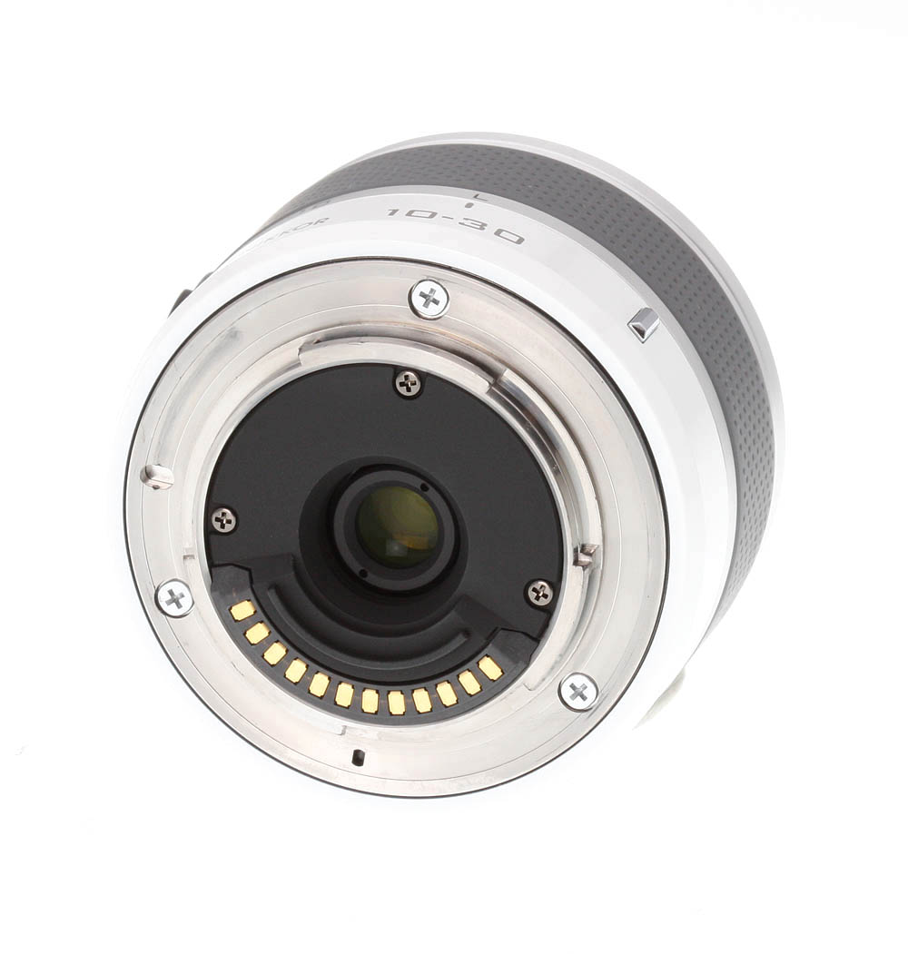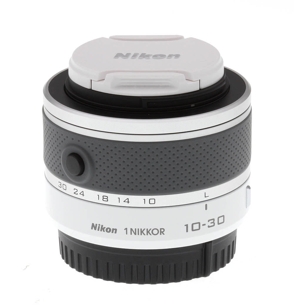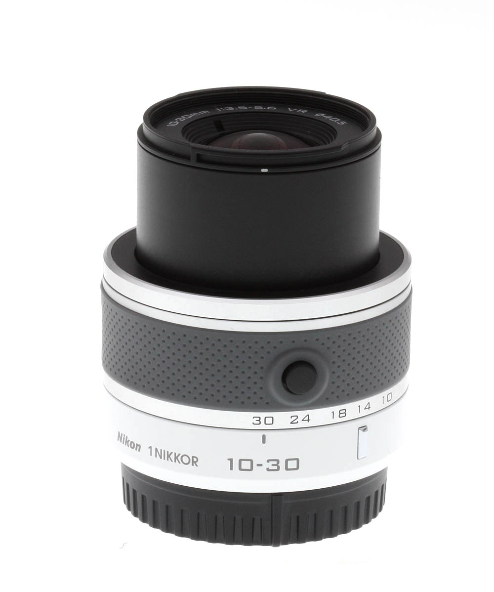 The Nikon 10-30mm ƒ/3.5-5.6 VR is a small zoom lens, mating very nicely with our J1 test body and providing a stable, if small and light, shooting platform. The lens is available in five colors: red, white, silver, black and pink. Our sample was the fashionable glossy white version. The only control on this lens is the retractable lens lock switch; pressing this button and turning the zoom ring extends the lens for use, as well as turning on the camera.
