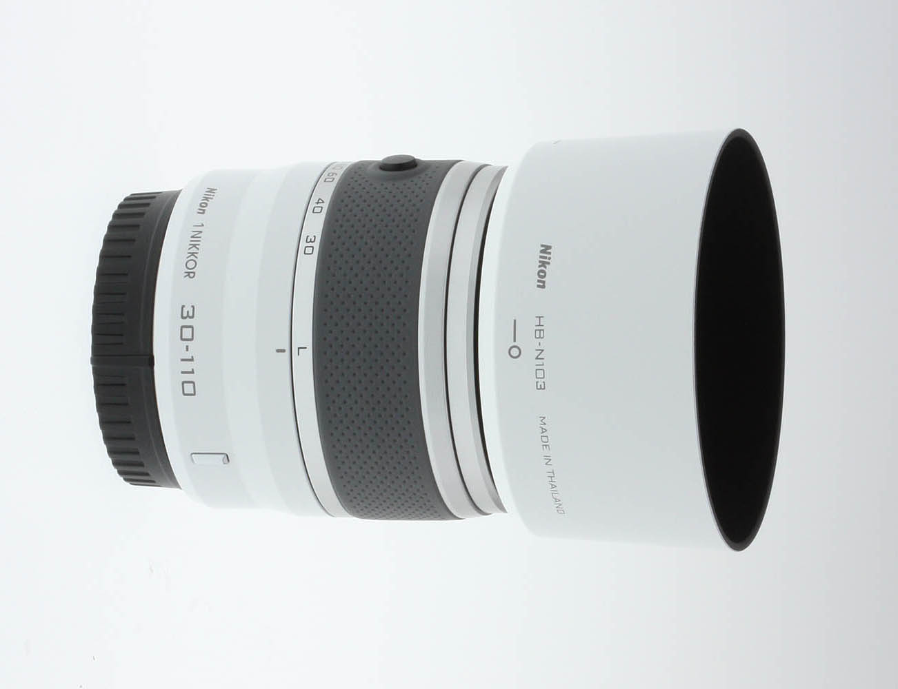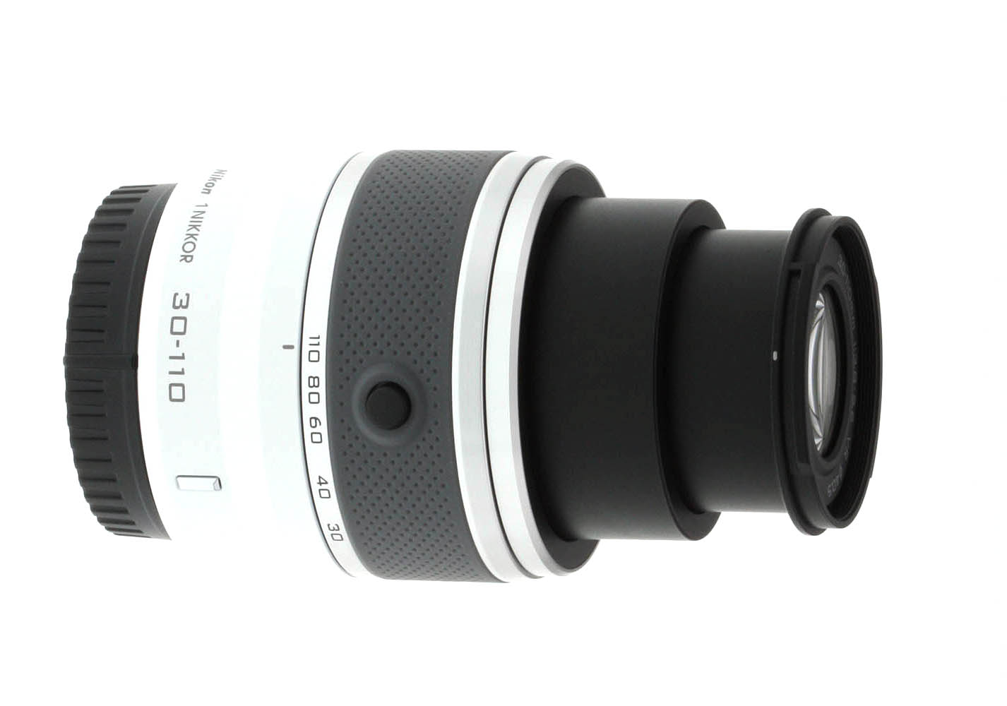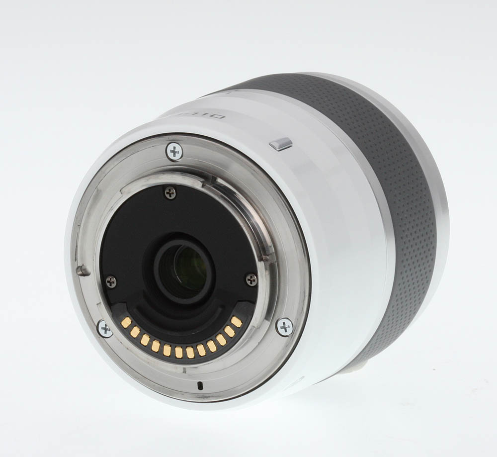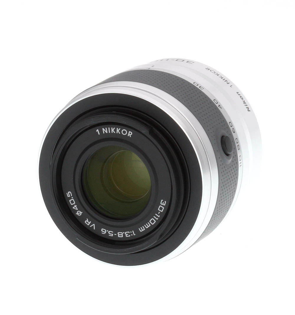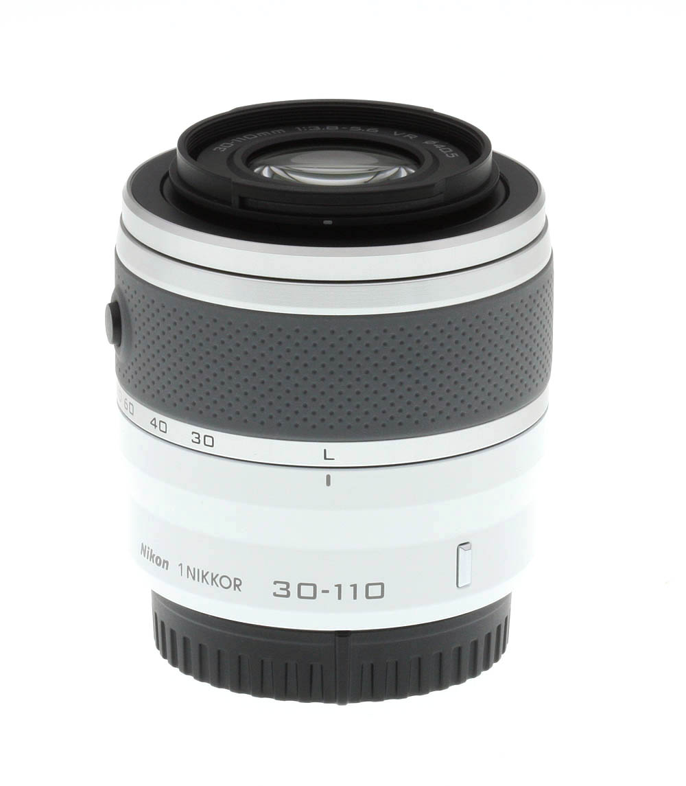 The Nikon 30-110mm ƒ/3.8-5.6 VR is a small zoom lens, mating very nicely with our J1 test body and providing a stable, if small and light, shooting platform. The lens is available in five colors: red, white, silver, black and pink. Our sample was the fashionable glossy white version. The only control on this lens is the retractable lens lock switch; pressing this button and turning the zoom ring extends the lens for use, as well as turning on the camera.