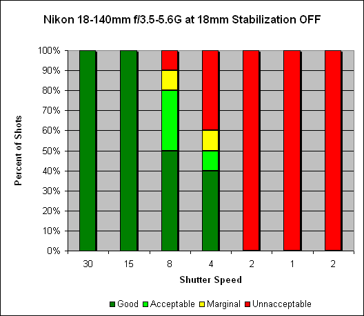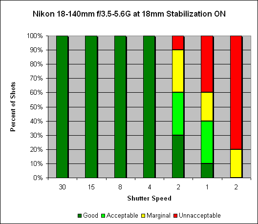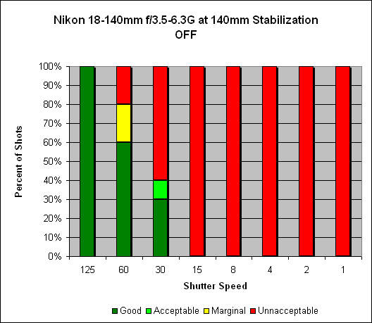 Zoomed in to 140mm, we see an impressive improvement of 4 stops; unstabilized, we see stable shots at 1/125 of second. With VR enabled, we now see stable results at 1/8 of a second (and even 60% sharp shots at 1/4 of a second).