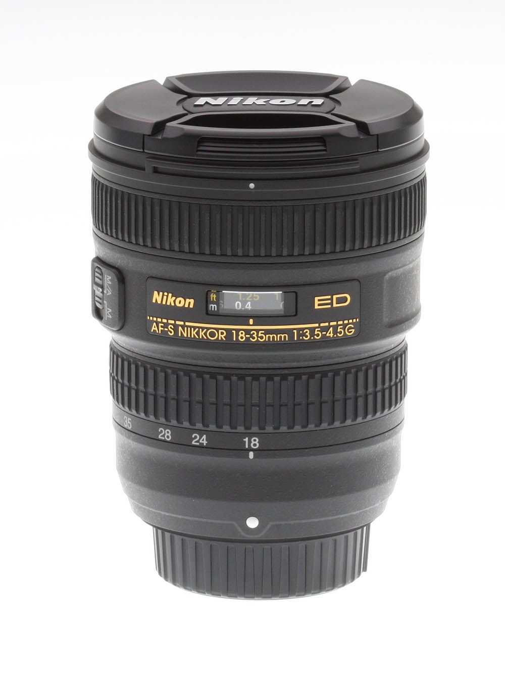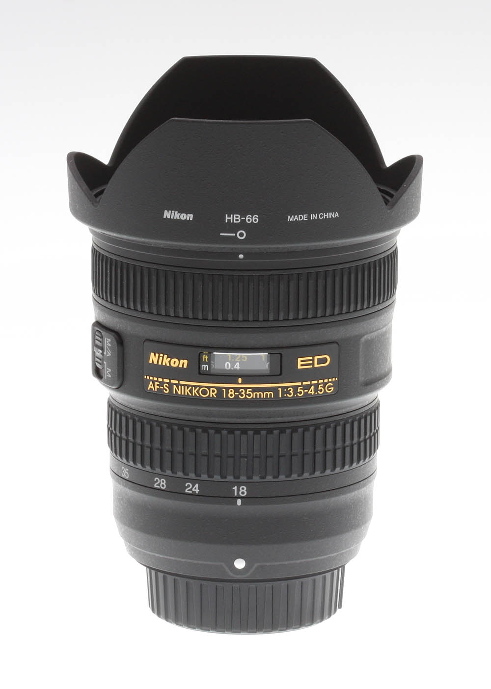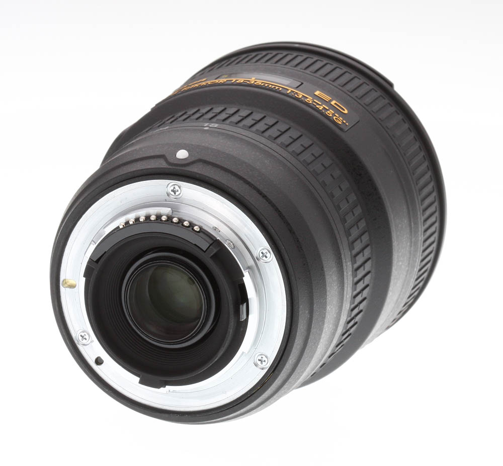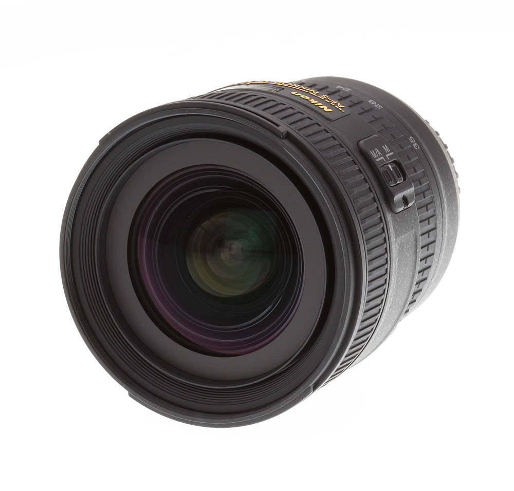 The 18-35mm ƒ/3.5-4.5G ED AF-S is composed mostly of polycarbonate plastic, finished in Nikon’s mottled black matte finish. Thanks to the plastic construction it is very light and portable (385 grams, or just over 13 ounces). Then lens has a distance scale under a plastic window, marked in feet and meters, but there are no depth of field markings and neither is there an infrared index mark. Apart from the zoom and focus rings, there is just a single switch to enable or disable autofocus on the lens (marked M and M/A).