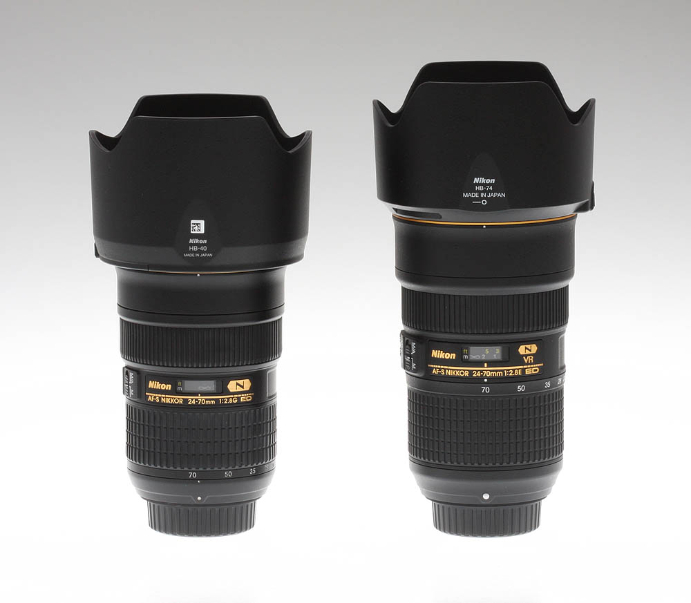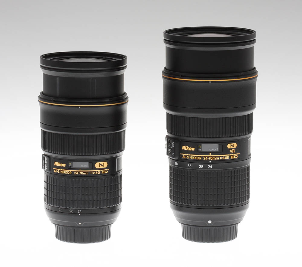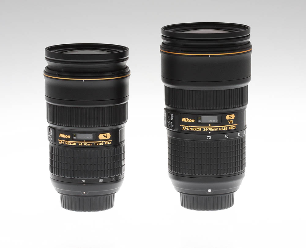 Nikon released this new version of its 24-70mm lens series towards the end of 2015: the big news is the inclusion of Vibration Reduction. Also, the new lens uses Nikon's new electromagnetic diaphragm ("E" designation), which utilizes a motor to operate the aperture under CPU control, rather than the mechanical linkage of D/G type lenses.