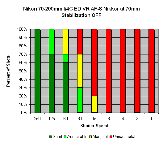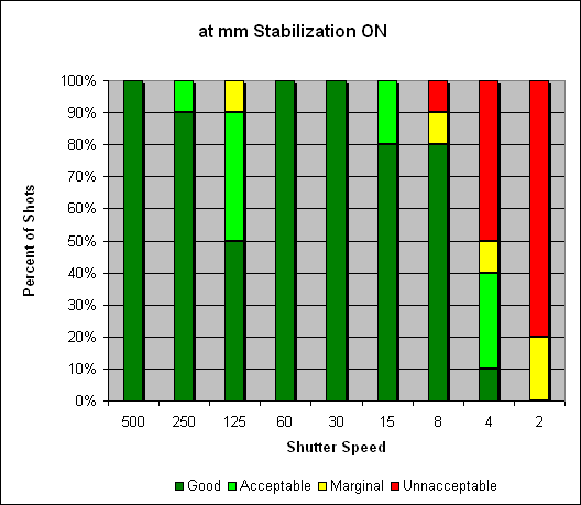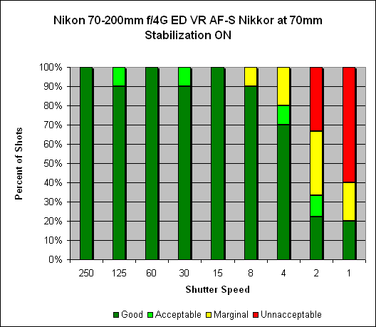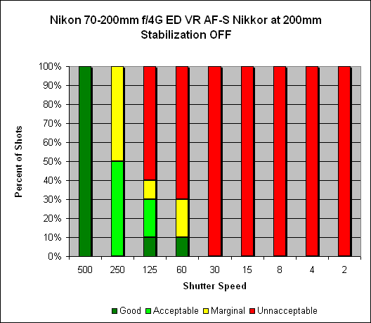 At 200mm it's a different (and complicated) story. There is improvement when vibration reduction is enabled, it just doesn't seem to produce the same amazing difference as noted above. Rather, there is generalized improvement throughout the range (including one particularly great result at 1/8s). We're still reviewing the results at 200mm, so take it with a grain of salt for now.
