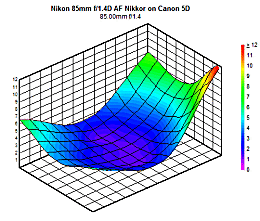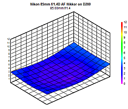 On the D200 and set to ƒ/1.4, this sample of the 85mm produced a sharp image, but not as sharp as some of the newer Nikkor lenses we have reviewed. This can hardly be surprisingly; the design and technology used in this lens is over 13 years old. That said, it's still quite sharp, at just under 2 blur units in the central region and 3 in the corners. Stopping down to ƒ/2 renders a dramatic improvement, with an impressive sweet spot of sharpness in the central region. By ƒ/2.8 this sweet spot improves to fill almost the entire frame, and by ƒ/4 only traces of corner softness remain. Diffraction limiting sets in by ƒ/11, but the effect is minimal as the lens is stable at 1.5 blur units at both ƒ/11 and ƒ/16.