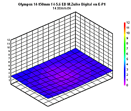 The E-P1 corrects distortion in-camera, so it's no surprise that there is very little distortion evident in our test images. There is a fraction of pincushion distortion at 14mm, but otherwise, it's essentially zero.
