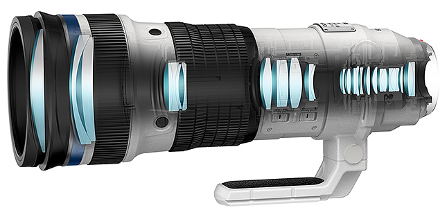 According to Olympus, one of the primary goals of the R&D department when developing this lens was to get it as light as possible (under 2kg) while also maintaining a rugged, durable construction. Olympus tells us that the lens barrel is constructed primarily out of magnesium alloy along with some carbon-fiber-reinforced plastic. The size advantages of the Micro Four Thirds platform, which for one thing allows for the use of smaller lens elements, allowed the engineers to use less magnesium alloy in the construction, which in turn made for a smaller and lighter lens that's still strong, solid and, of course, thoroughly weather-sealed.