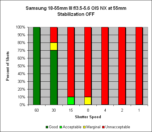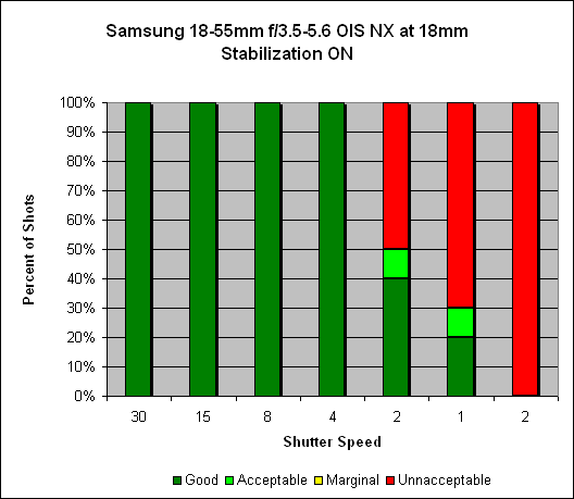 At 18mm, we see at least two stops of hand-holding stability improvement. With OIS turned off, we get 80% of our hand-held shots sharp at the 1/15s shutter speed setting, which conforms to the one-over-focal-length rule of thumb. With OIS turned on, we get 100% sharp shots at the 1/4s shutter speed setting.